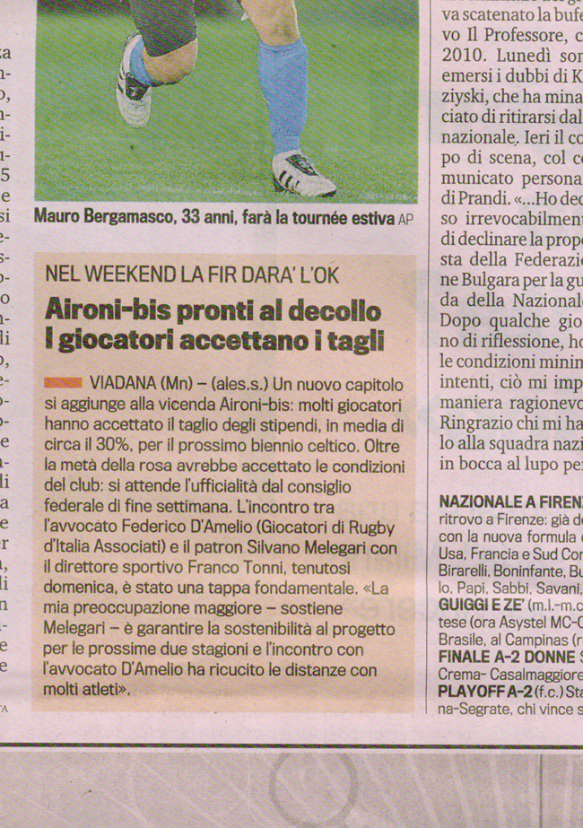 Gazzetta dello Sport. Aironi- bis pronti al decollo. I giocatori accettano i tagli