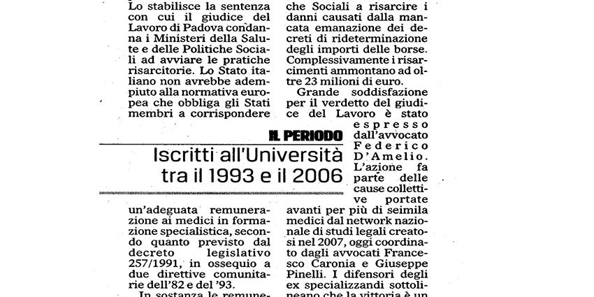 24 Maggio 2016. Il Gazzettino. Risarcimento milionario per 600 specializzandi