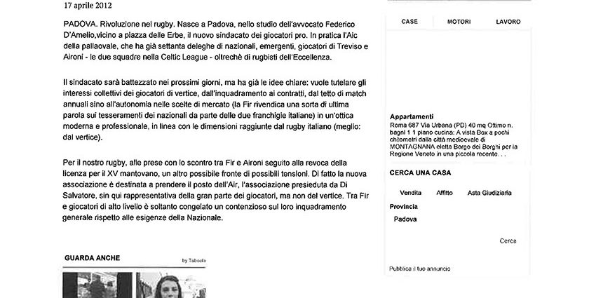 12 Aprile 2012. Il Mattino di Padova. Nasce a Padova il sindacato dei rugbisti “pro”